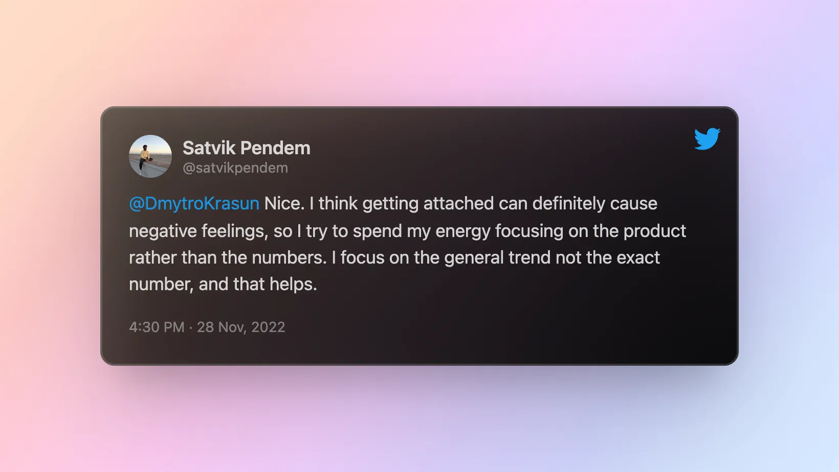 Internal deep attachment to the MRR number is not sustainable and negatively impacts my mental health. I havenât found a solution to it yet, but Satvik Pendem gave me a direction to consider: